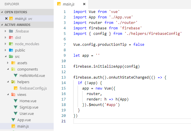 Next we update the main.js file to initialize our project based on our new firebaseConfig file.